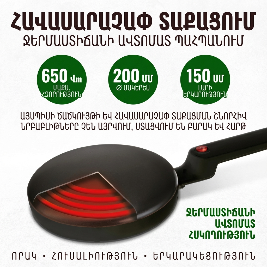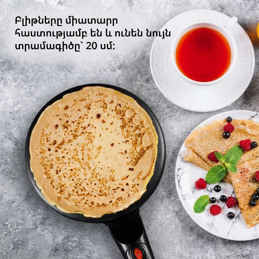 Սարքի շնորհիվ բլինները պատրաստվում են արագ, հավասար ու կատարյալ՝ խնայելով ձեր ժամանակը և ապահովելով պրոֆեսիոնալ արդյունք